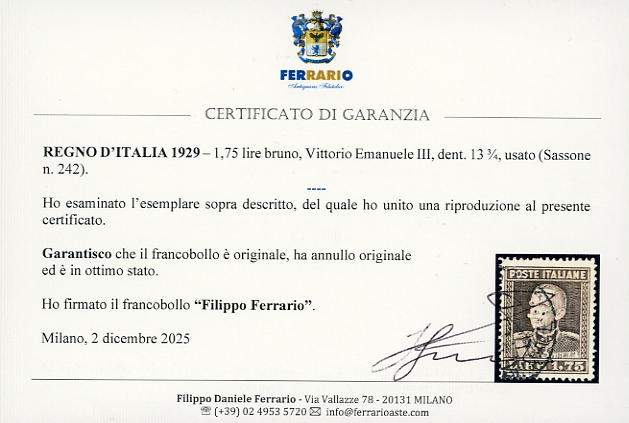 1929 - 1,75 lire bruno Vittorio Emanuele III, dent. 13 3/4 (242), usato, ottimo stato. Colla, Cert. Ferrario.