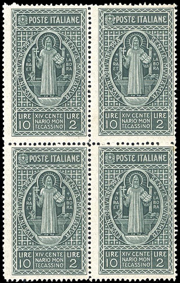 1929 - 10 + 2 lire Montecassino, carta sottile (268a), blocco di quattro, nuovo, gomma originale integra, perfetto. G.Bolaffi, Ferrario.