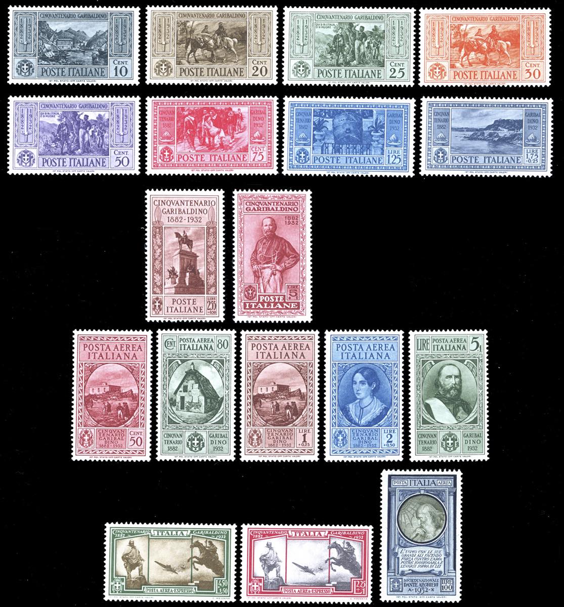 1932 - Garibaldi, serie completa con 100 lire posta aerea (315/324+A32/A38+A41), gomma originale integra, perfetti. Molto belli. Ferrario.