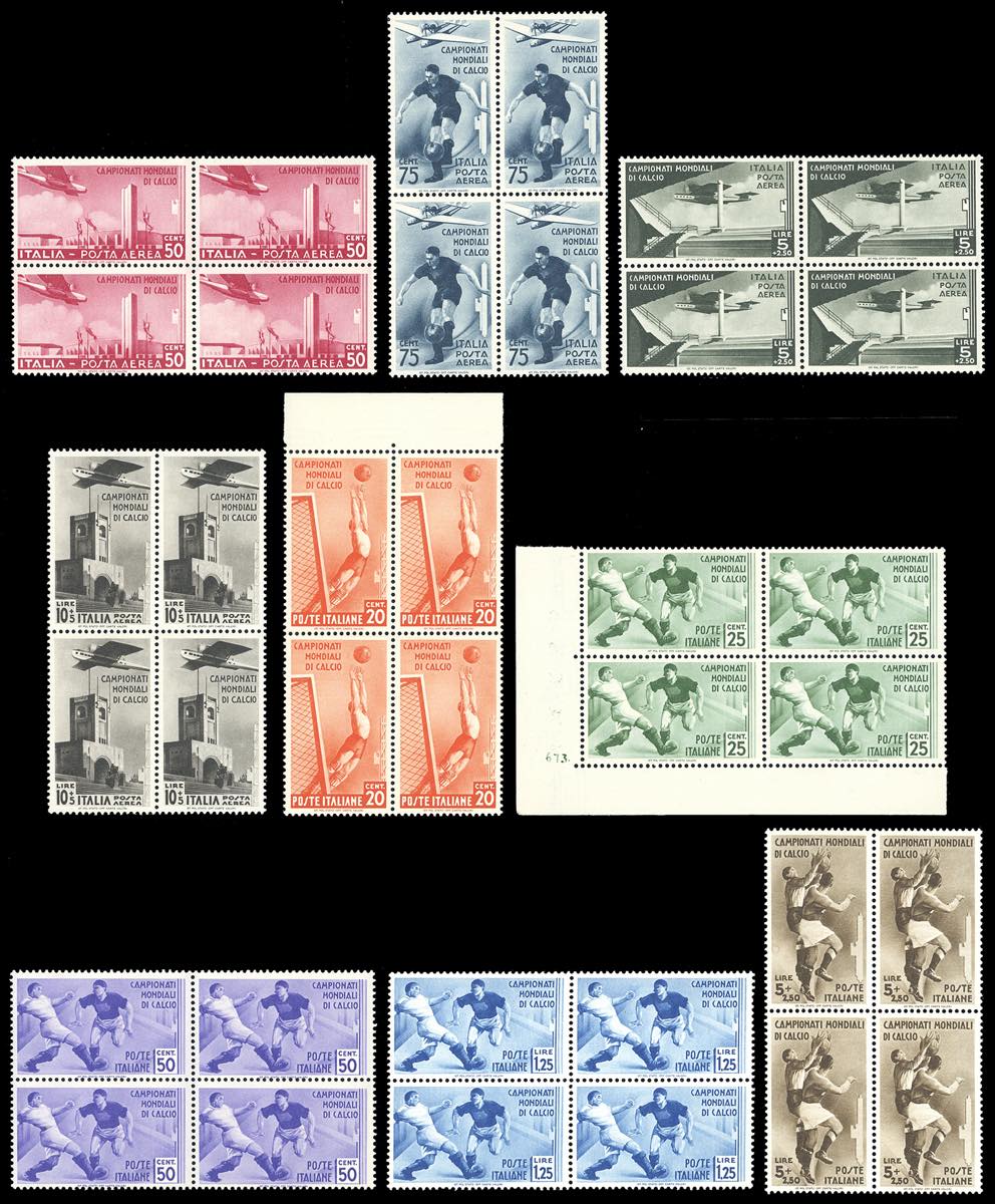 1934 - Mondiali di calcio, serie compelta (357/361+A), blocchi di quattro, nuovi, gomma originale integra, perfetti. Cert. Diena per gli alti valori.