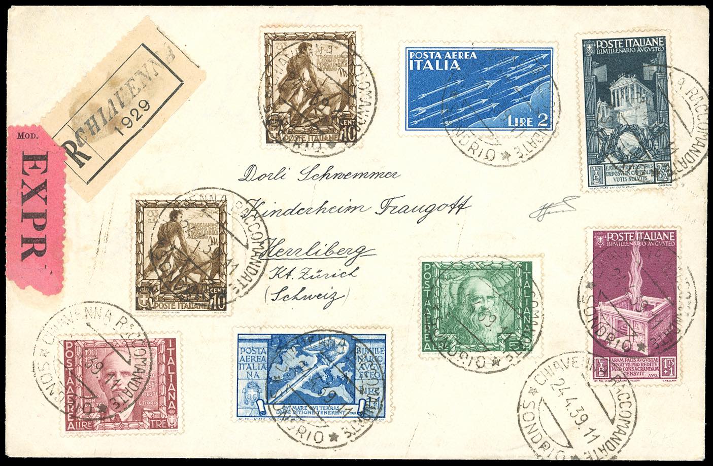 1939 - 1,75+1 lira, 2,55+2 lire posta ordinaria e 1+1 lira Augusto posta aerea, 3 e 5 lire Impero posta aerea e complementari (424,425,A109,439,A115,A116,A15), perfetti, su raccomandata espresso da Chiavenna 24/4/1939 per la Svizzera, bollo d'arrivo. Bella e rara affrancatura multipla con gli alti valori. Cert. Ferrario.