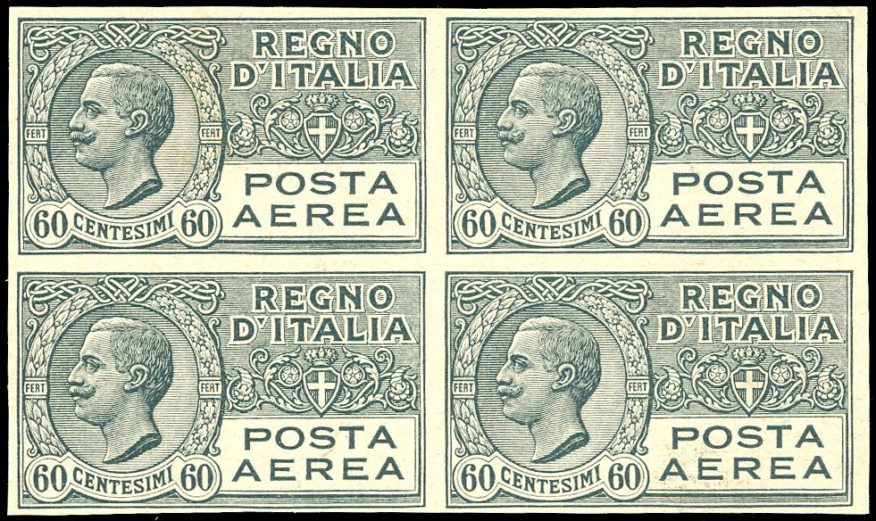 1926 - 60 cent. Vittorio Emanuele III (3), prova di macchina nel colore adottato, su carta grigiastra spessa, senza filigrana, non dentellata, blocco di quattro, nuovo, senza gomma come sempre, perfetto. Non comune. Cert. E.Diena.