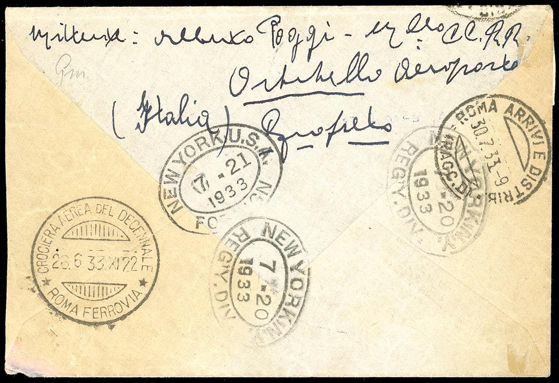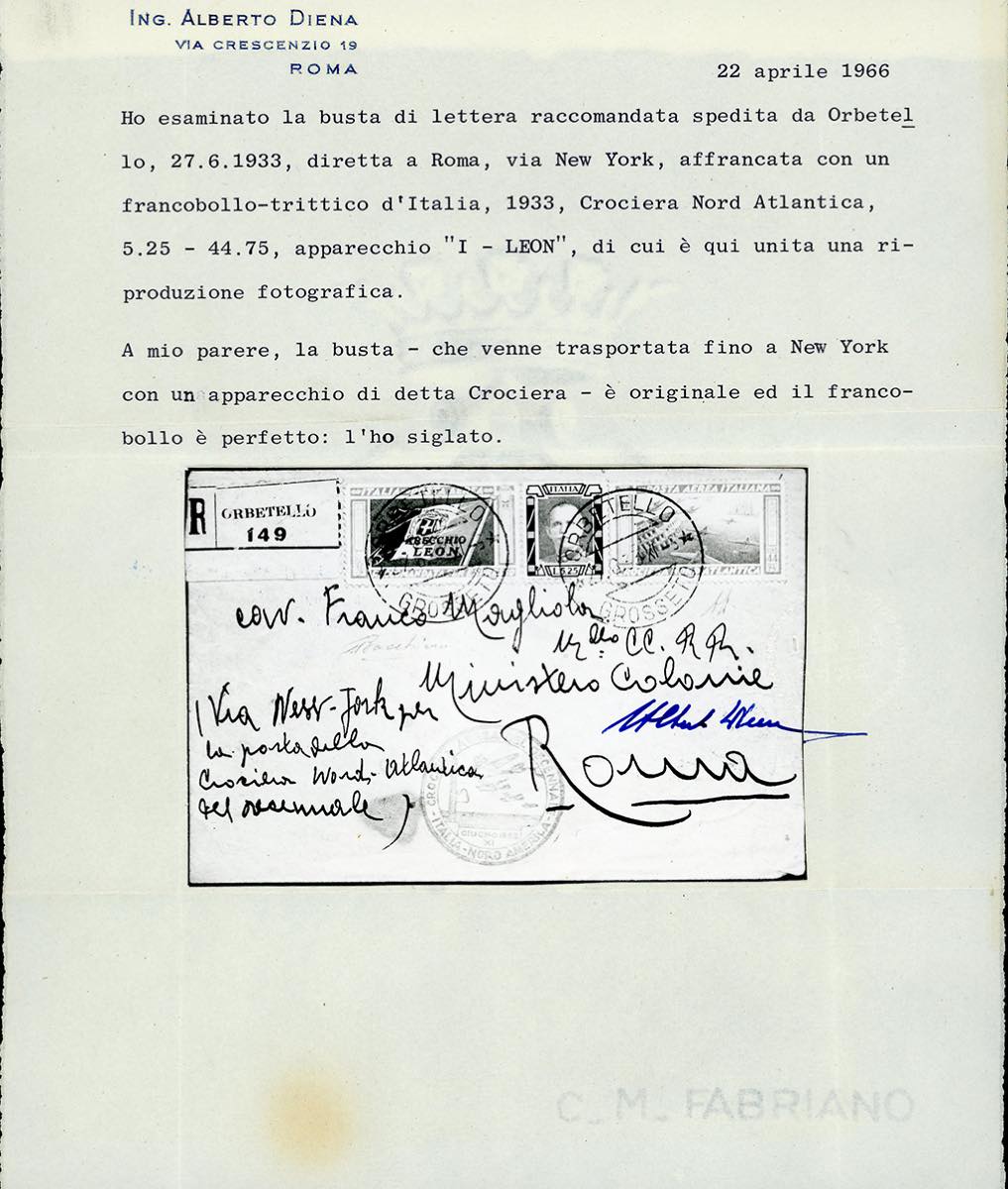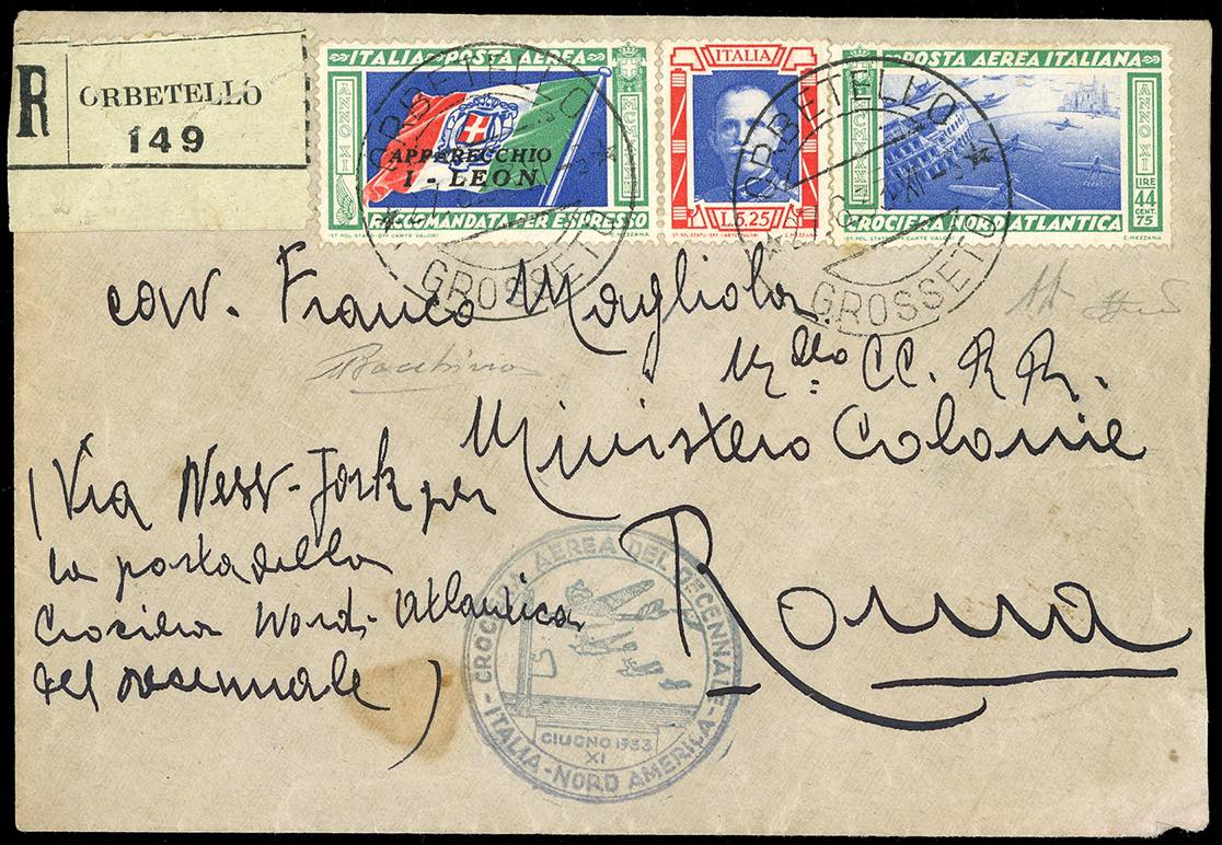 1933 - 5,25 + 44,75 lire Trittico I-LEON (52H), applicato con le sezioni separate, perfetto, su aerogramma raccomandato da Orbetello 27/6/1933 a Roma, via New York, bollo di transito al verso, sul fronte e al verso i bolli speciali commemorativi della Crociera. Molto raro con le sezioni staccate. Ferrario. Cert. A.Diena.