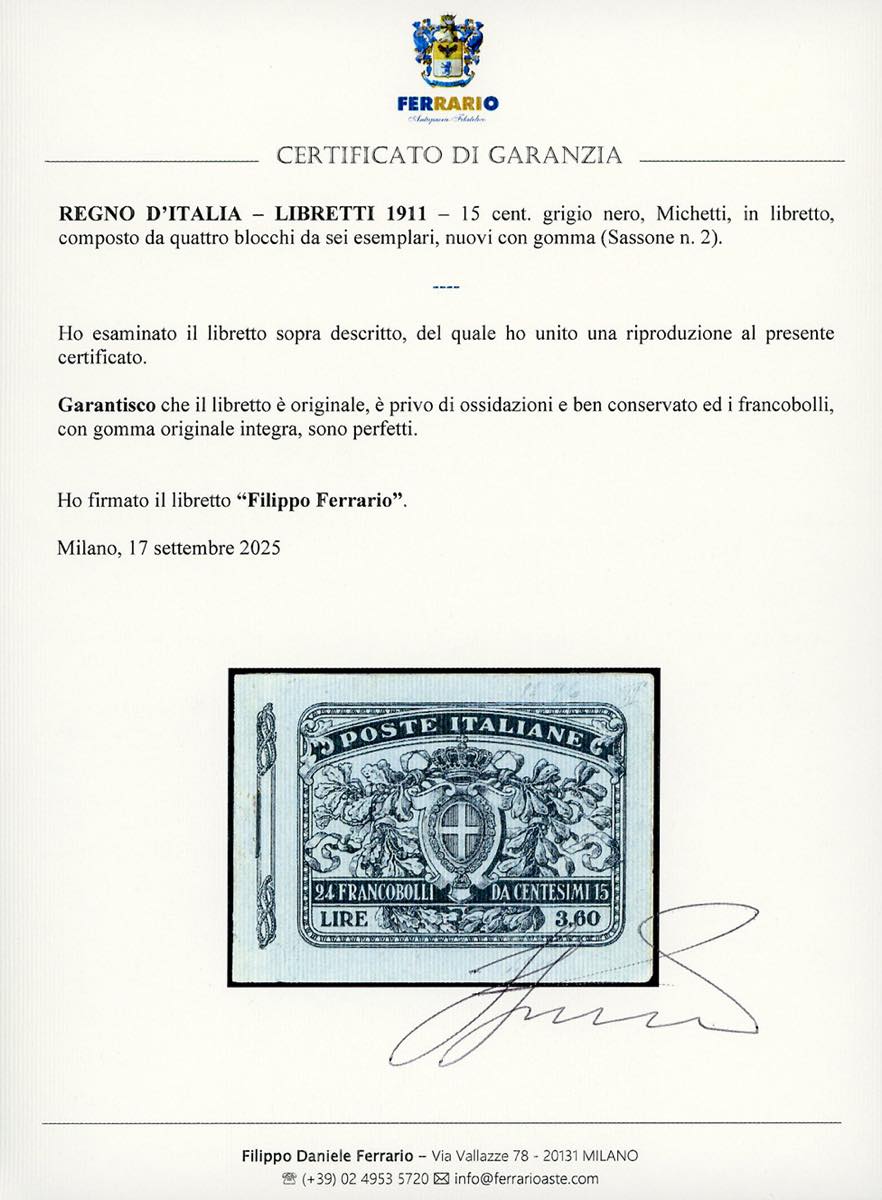 1911 - 15 cent. Michetti, libretto completo di 24 esempalri (2), nuovo, gomma originale integra, perfetto e di ottima qualità. Cert. Ferrario.