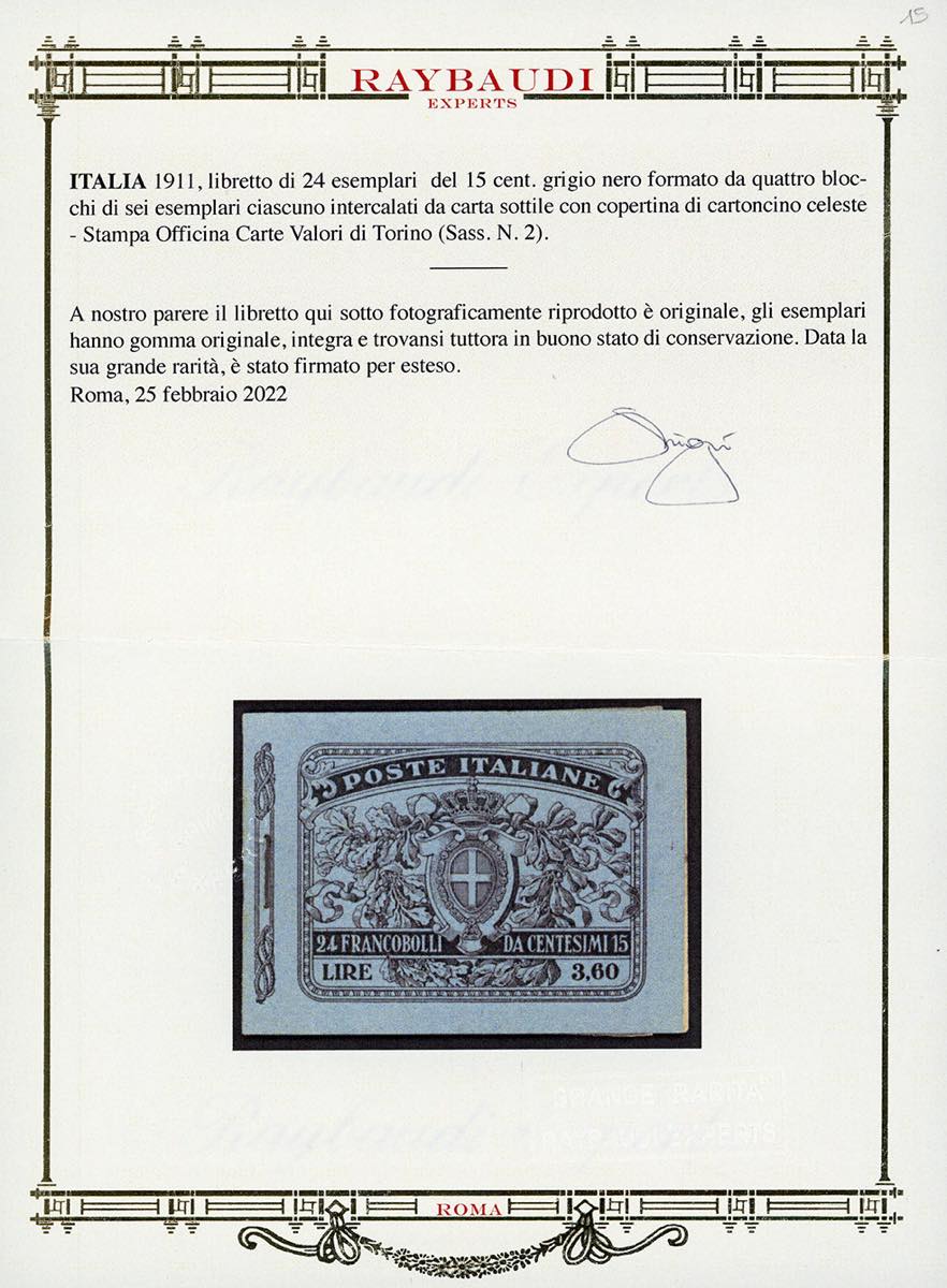 1911 - 15 cent. Michetti, libretto completo di 24 esemplari (2), nuovo, gomma originale integra, sei francobolli presentano consueti piccoli puntini di ossidazioni. Raro. Cert. Oro Raybaudi.