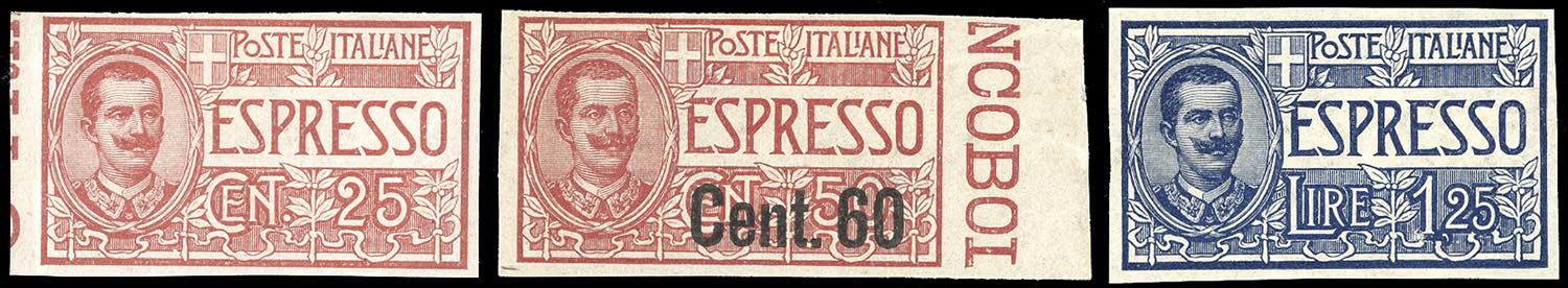 1903/1926 - 25 cent., 60 cent. su 50 cent., 1,25 lire, tutti non dentellati (1a,6k,12b), nuovi, gomma originale, integra per l'1,25 lire, perfetti.