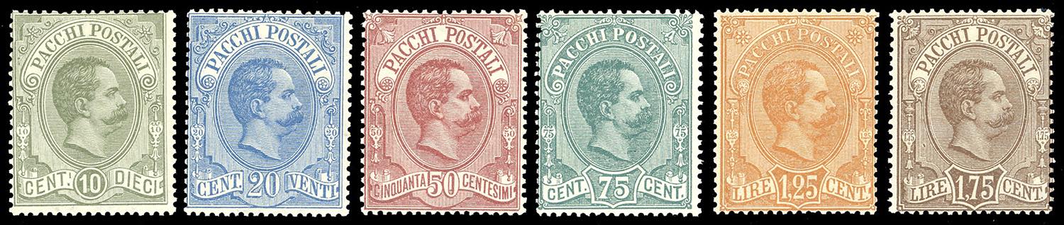 1884/86 - Umberto I, serie completa (1/6), discreta centratura, gomma originale integra, perfetti. Cert. Caffaz per i primi due valori.