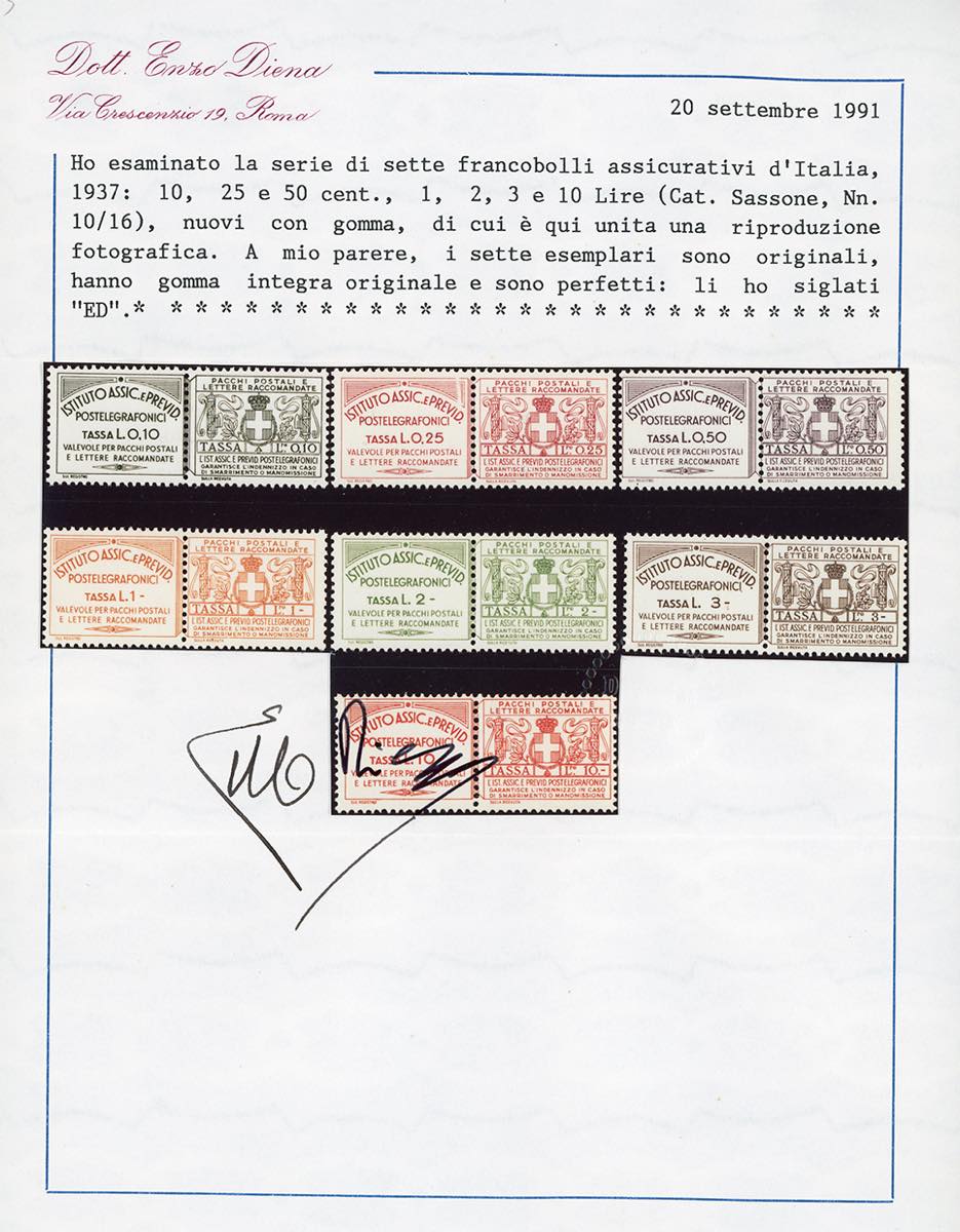 1936 - Istituto Assicurazioni, serie completa (10/16), nuovi, gomma originale integra, perfetti e molto freschi. Ottima qualità. Cert. E.Diena.