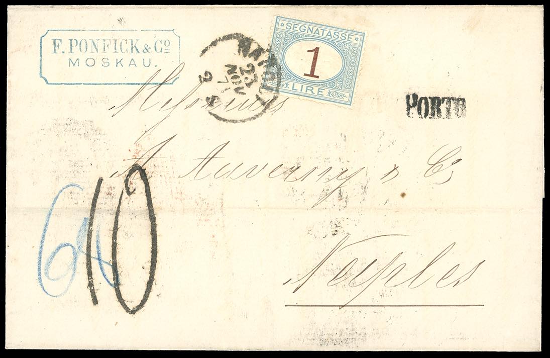 1871 - 1 lira azzurro chiaro e bruno (11), buono stato, usato in arrivo su fresca lettera non affrancata da Mosca a Napoli 23/11/1871, segni di tassa sul fronte e bolli in cirillico al verso. Rara.