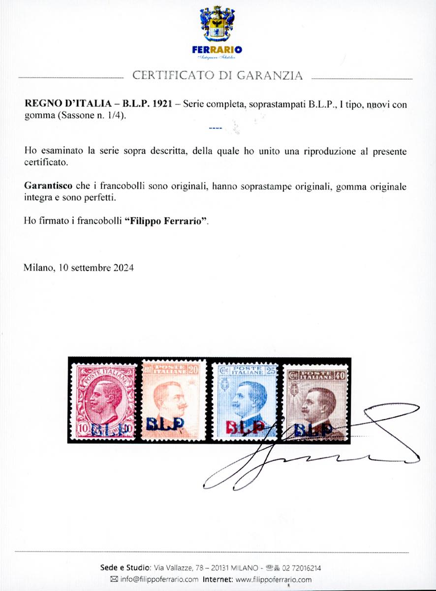1921 - Soprastampa BLP, I tipo, serie completa (1/4), gomma originale integra, perfetti. Em.Diena/Chiavarello, cert. Ferrario.