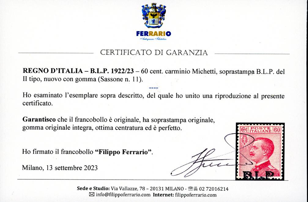 1922/23 - 60 cent. carminio Michetti, soprastampa BLP del II tipo (11), nuovo, gomma originale integra, perfetto. Splendido ed ottimamente centrato. Impreziosito dalla soprastampa in basso in parte presente sui dentelli superiori. Molto raro con questa centratura. A.Diena, Cert. Ferrario.