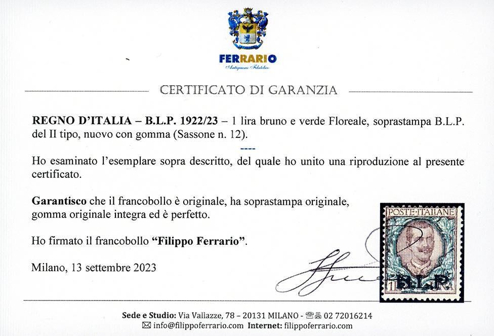 1922/23 - 1 lira Floreale, soprastampa BLP del II tipo (12), nuovo, gomma originale integra, perfetto. Fresco. A.Diena, cert. Ferrario.