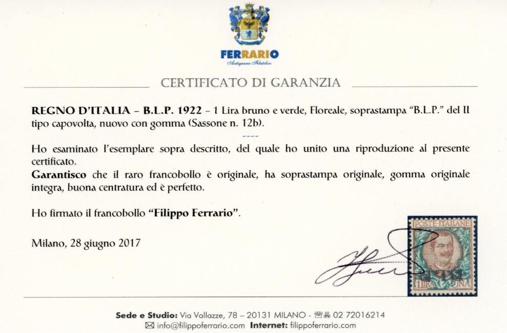 1922/23 - 1 lira soprastampa BLP del II tipo capovolta (12b), nuovo, gomma originale integra, perfetto e di buona centratura. Fresco e raro. Sorani. Cert. Ferrario.