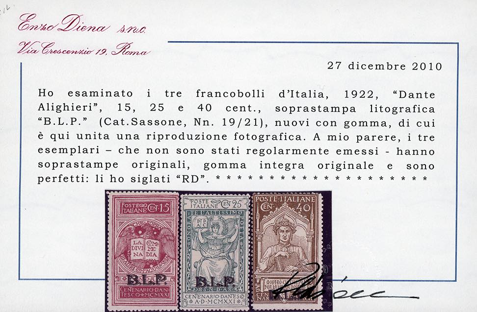 1922 - Dante, soprastampati BLP, non emessi, serie completa (19/21), gomma originale integra, perfetti. Molto rari, tiratura 50 serie complete. Cert. Diena.