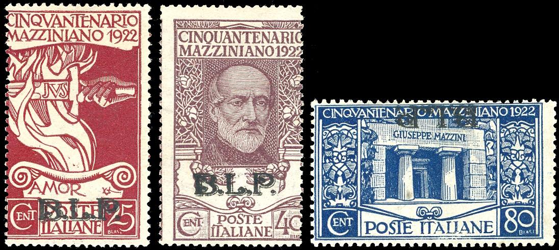 1922 - Mazzini, soprastampa BLP, capovolta per l'80 cent., serie completa (26,27,28a), nuovi, gomma originale integra, perfetti. Molto ... Leggi tutto