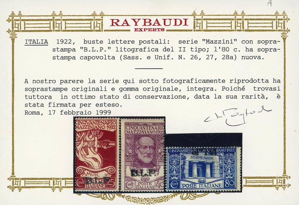 1922 - Mazzini, soprastampa BLP, capovolta per l'80 cent., serie completa (26,27,28a), nuovi, gomma originale integra, perfetti. Molto rari, tiratura 50 serie complete, di cui solo 25 esemplari dell'80 cent. con soprastampa capovolta. Sorani per l'80 cent, cert. Oro Raybaudi per la serie.