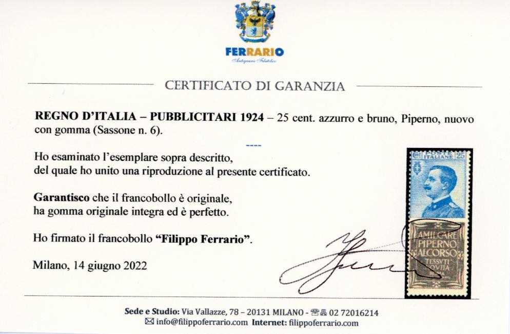 Lotto 1425 - 1924 - 25 cent. Piperno (6), gomma originale integra, ...