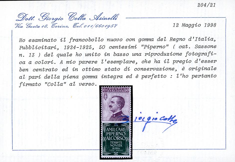 Lotto 1445 - 1924 - 50 cent. Piperno (13), nuovo, gomma originale ...