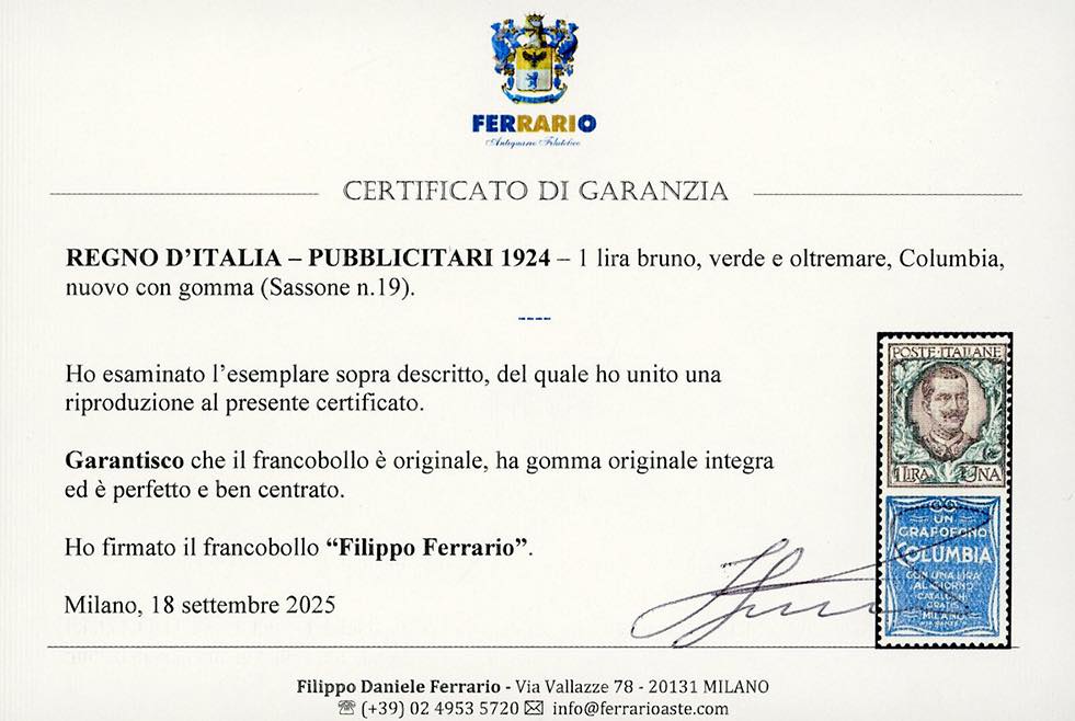 Lotto 1459 - 1924 - 1 lira Columbia (19), nuovo, gomma originale ...