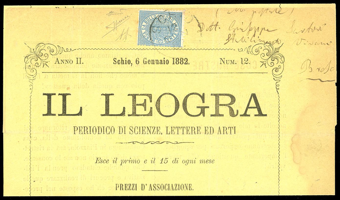 1882 - 1 cent. marca da bollo (5), ottimo stato, isolata su copertina del periodico "Il Leogra" da Schio 12/1/1882 a Brescia, in periodo di ... Leggi tutto
