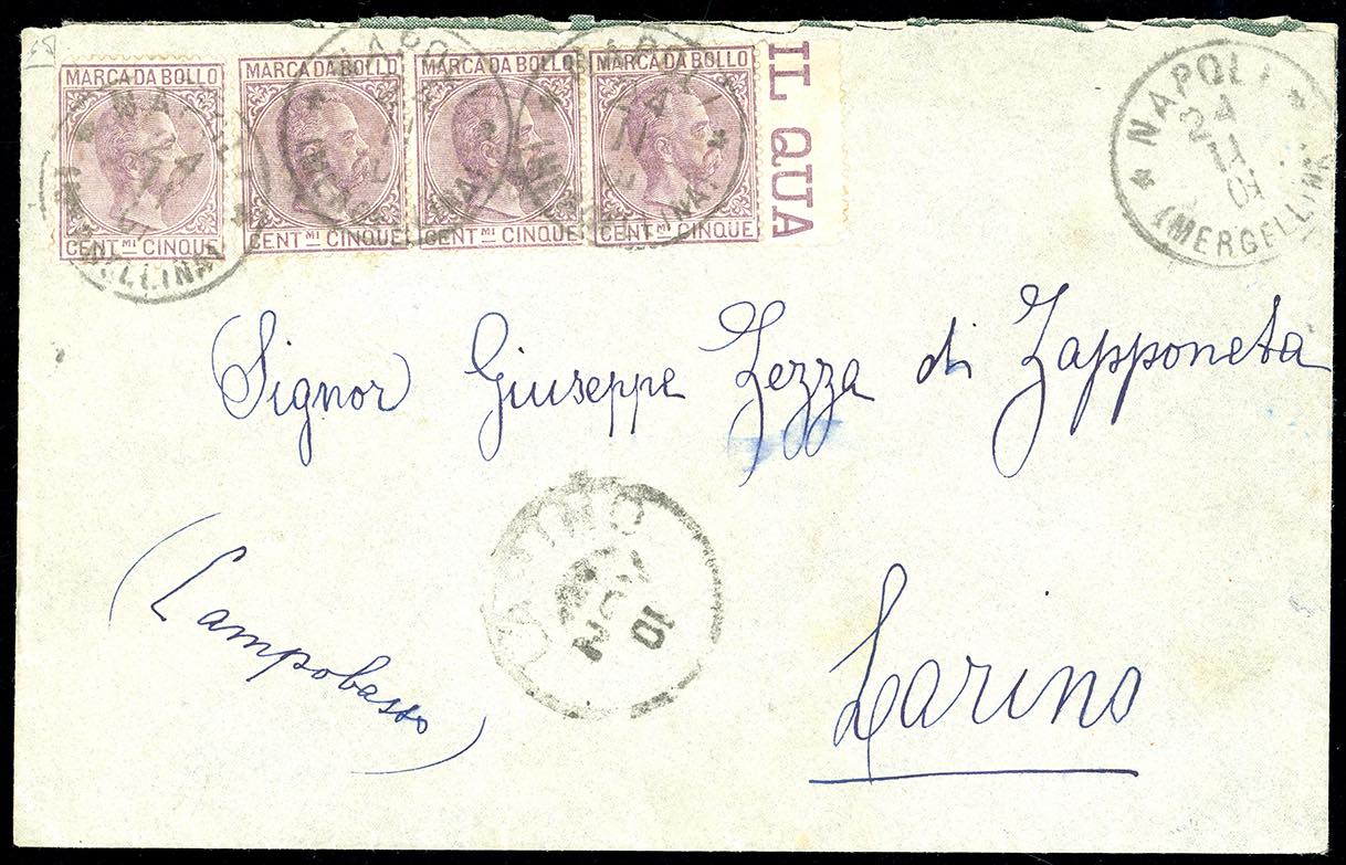 1901 - 5 cent. Umberto I marca da bollo (9), singolo, un angolo arrotondato, e striscia di tre, bordo di foglio, perfetta, su busta da Napoli 24/11/1901 a Larino, bollo d'arrivo. Rara affrancatura. E.Diena.