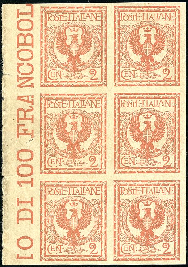1901 - 2 cent. Floreale (69), blocco di sei prove di macchina non dentellate, su carta grigiastra senza filigrana, perfetta, non gommata. ... Leggi tutto