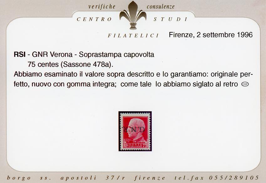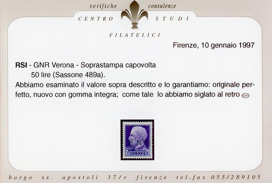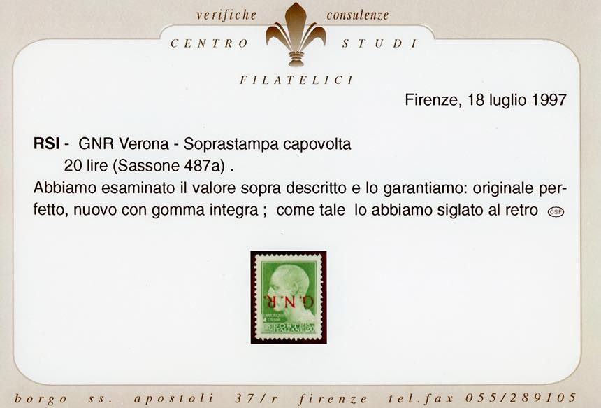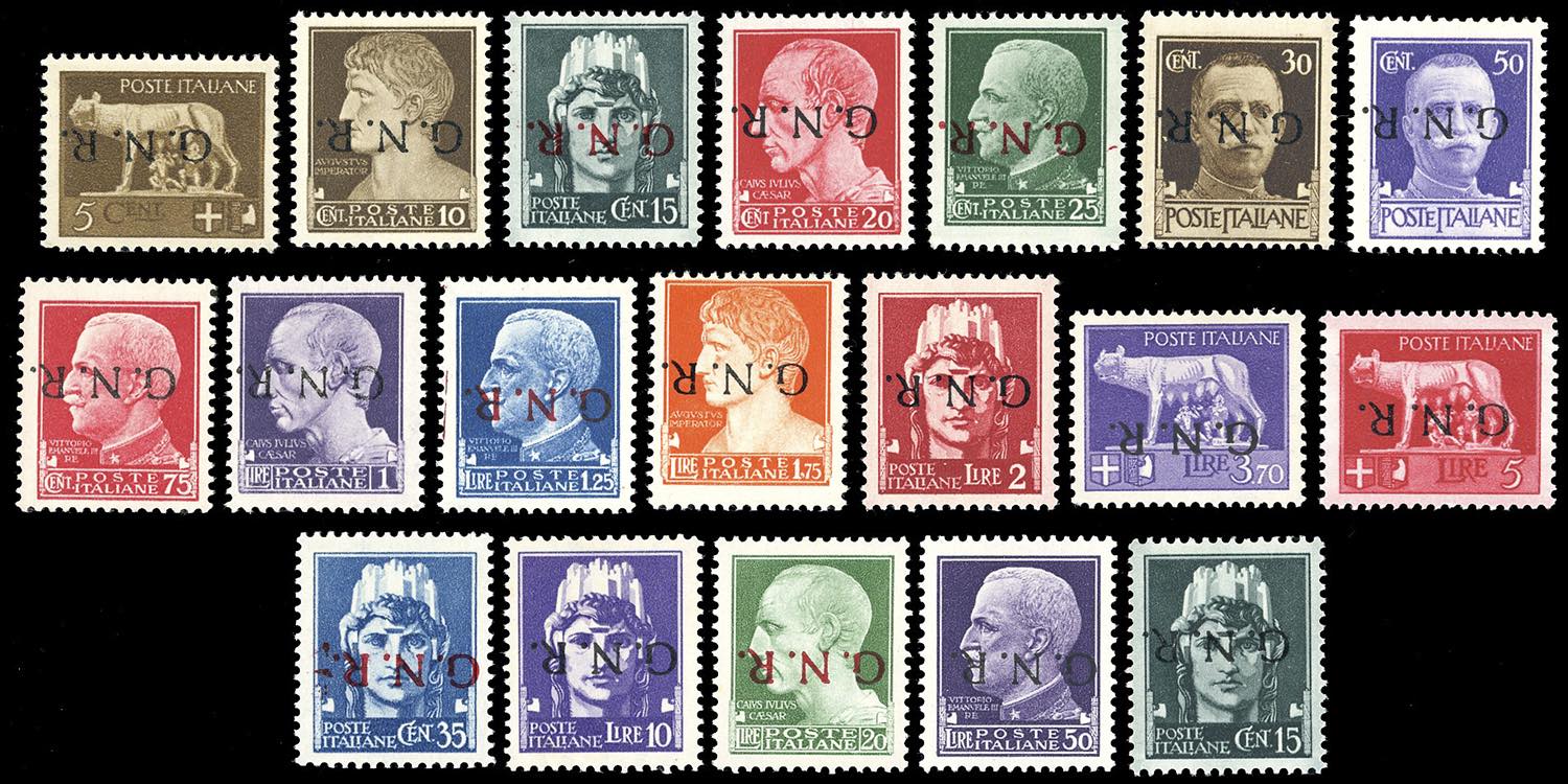 1944 - Soprastampati G.N.R. di Verona, serie completa con la soprastampa capovolta, 19 valori (470a/489a,472Aa), nuovi, gomma originale integra, perfetti. Raro insieme. Tutti firmati da noti ed affidabili periti, quattro cert. Centro Studi Filatelici.