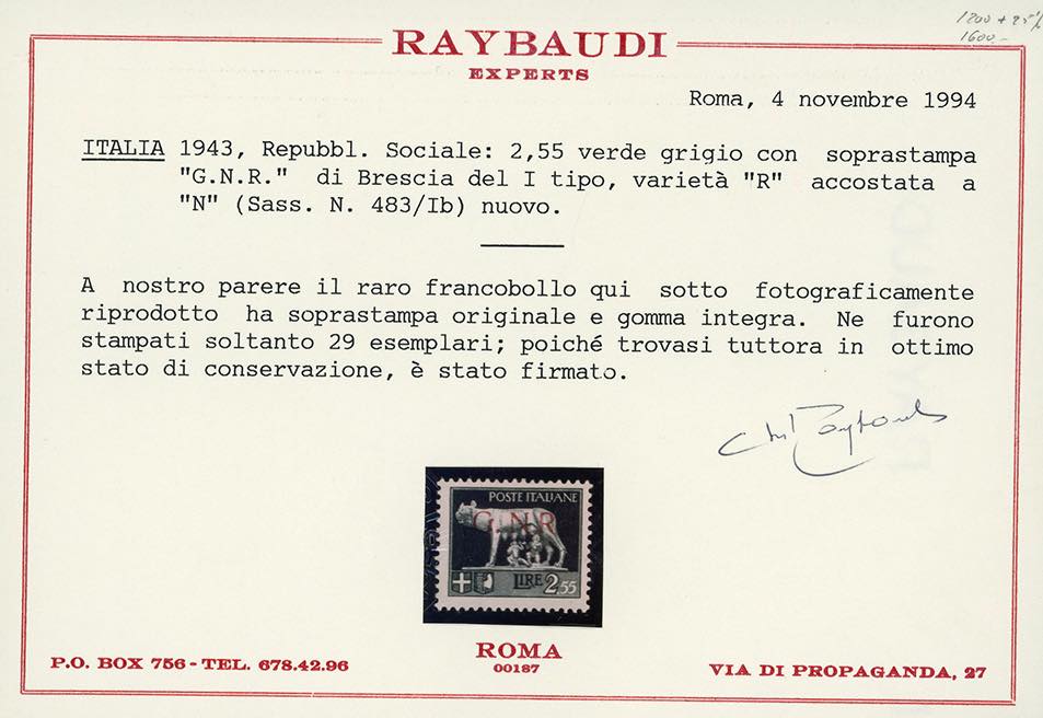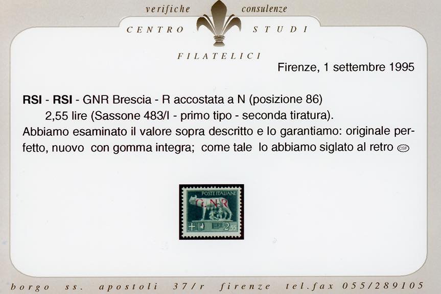 1943 - 2,55 lire, soprastampa G.N.R. di Brescia, I tipo, varietà "R" accostata a "N" (483/Il), nuovo, gomma originale integra, perfetto. Raro, tiratura 28 esemplari. Ferrario, cert. Raybaudi.