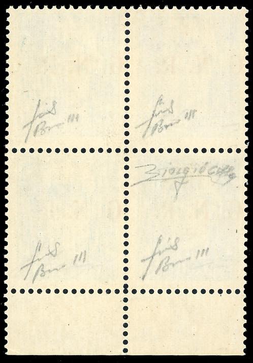 1943 - 35 cent., soprastama G.N.R. di Brescia, III tipo, blocco di quattro, un esemplare con varietà punti piccoli dopo la "G" e la "R", un altro con punti piccoli dopo la "N" e la "R" (476/IIIf,476/III), bordo di foglio, nuovo, gomma originale integra, leggera traccia di linguella solo sull'esemplare con la prima varietà, perfetto. Si tratta dell'UNICO BLOCCO NOTO CON QUESTE DUE VARIETA'. Cert. Colla e Fiecchi, firmato Ferrario.