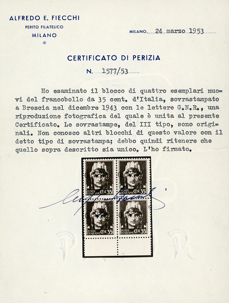 1943 - 35 cent., soprastama G.N.R. di Brescia, III tipo, blocco di quattro, un esemplare con varietà punti piccoli dopo la "G" e la "R", ... Leggi tutto