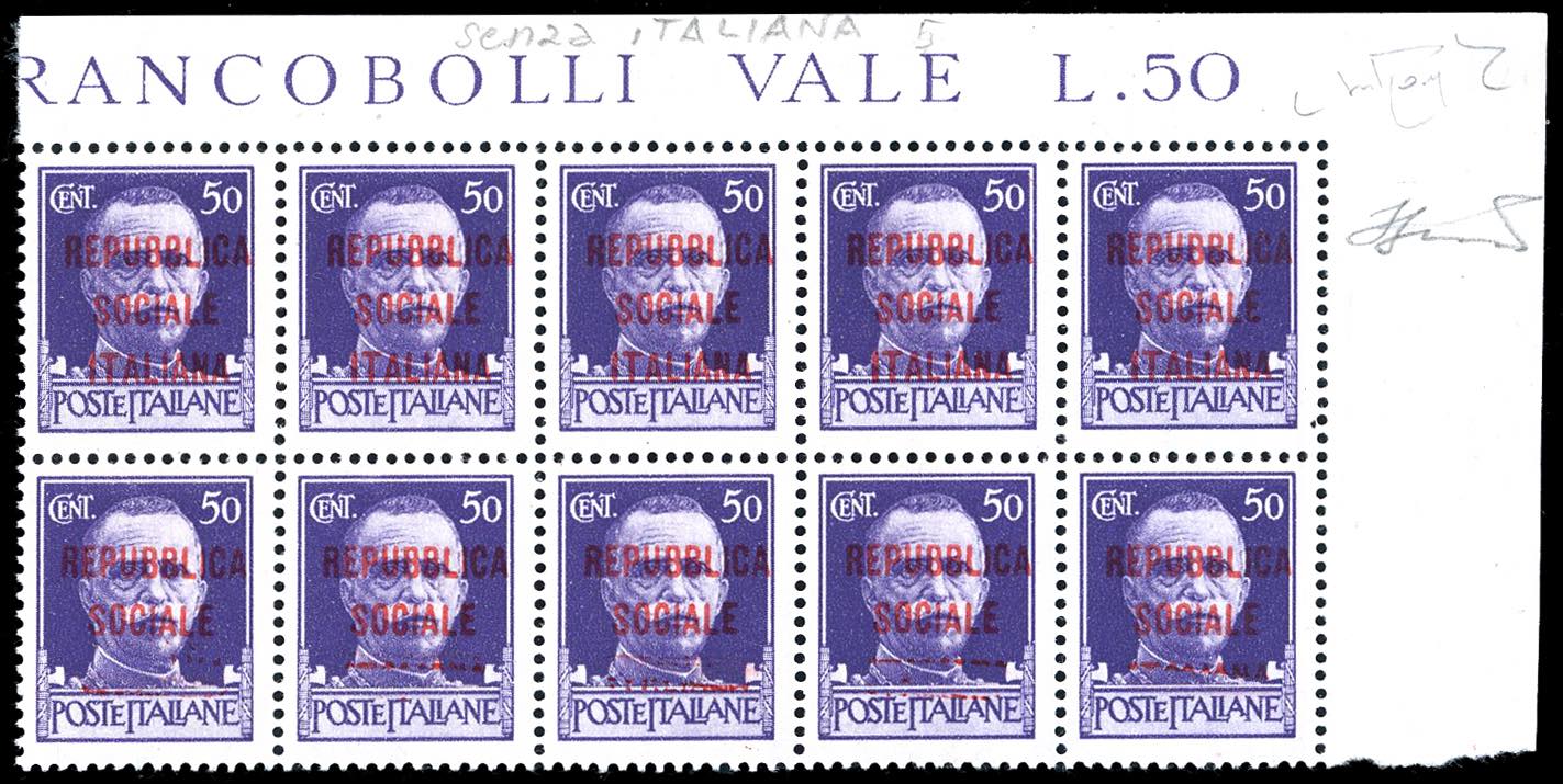 1944 - 50 cent. soprastampato (495), blocco di 10 esemplari, i cinque inferiori senza "ITALIANA", angolo di foglio, nuovo, gomma originale integra, perfetto. Bella e rara varietà occasionale, causata dall'interposizione di un corpo estraneo al momento della soprastampa. Probabilmente unico blocco noto. Raybaudi, Ferrario.