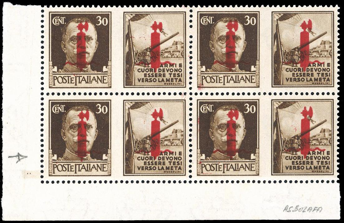 1944 - 30 cent. Esercito, soprastampa fascio su entrambe le sezioni in rosso, tiratura di Firenze, blocco di quattro, l'esemplare in posiz. ... Leggi tutto