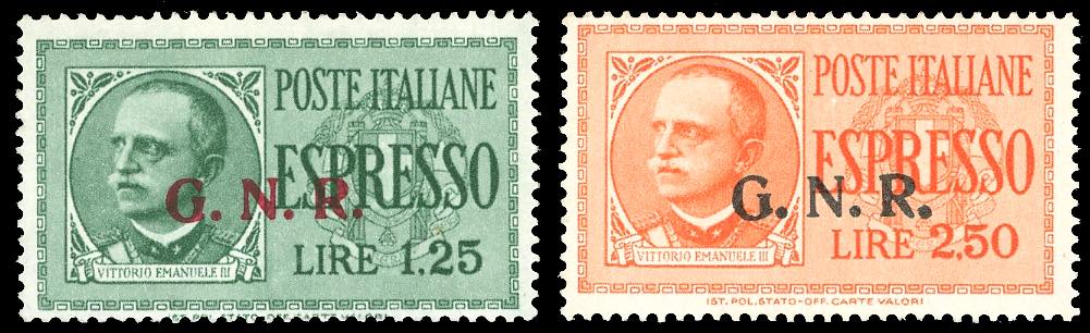 1944 - Soprastampati G.N.R., tiratura di Verona (19/20), nuovi, gomma originale integra, perfetti. Cilio, Ferrario.