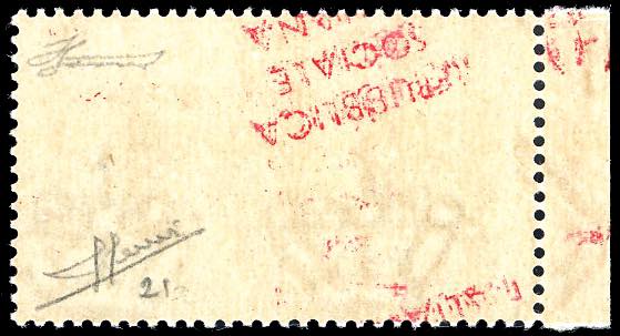 1944 - 1,25 lire soprastampato, soprastampa capovolta recto-verso, al verso capovolta e obliqua, al recto capovolta e fortemente anomala per l'abbondante inchiostrazione (21db), bordo di foglio, nuovo, gomma originale integra, perfetto. Molto raro. Sorani, Ferrario.