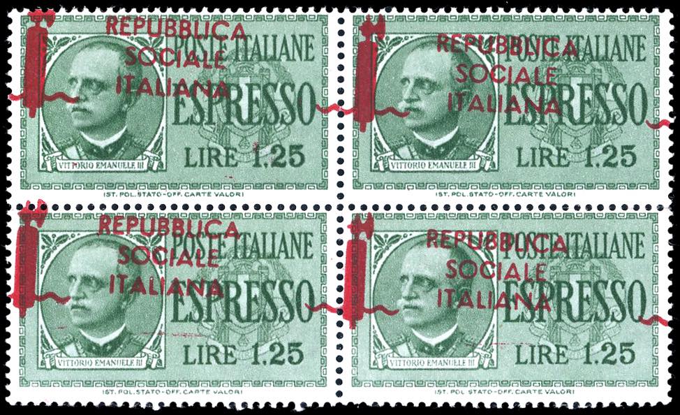 1944 - 1,25 lire soprastampato, blocco di quattro esemplari, soprastampa obliqua (21ha), nuovo, gomma originale integra, perfetto. Raybaudi, Ferrario.