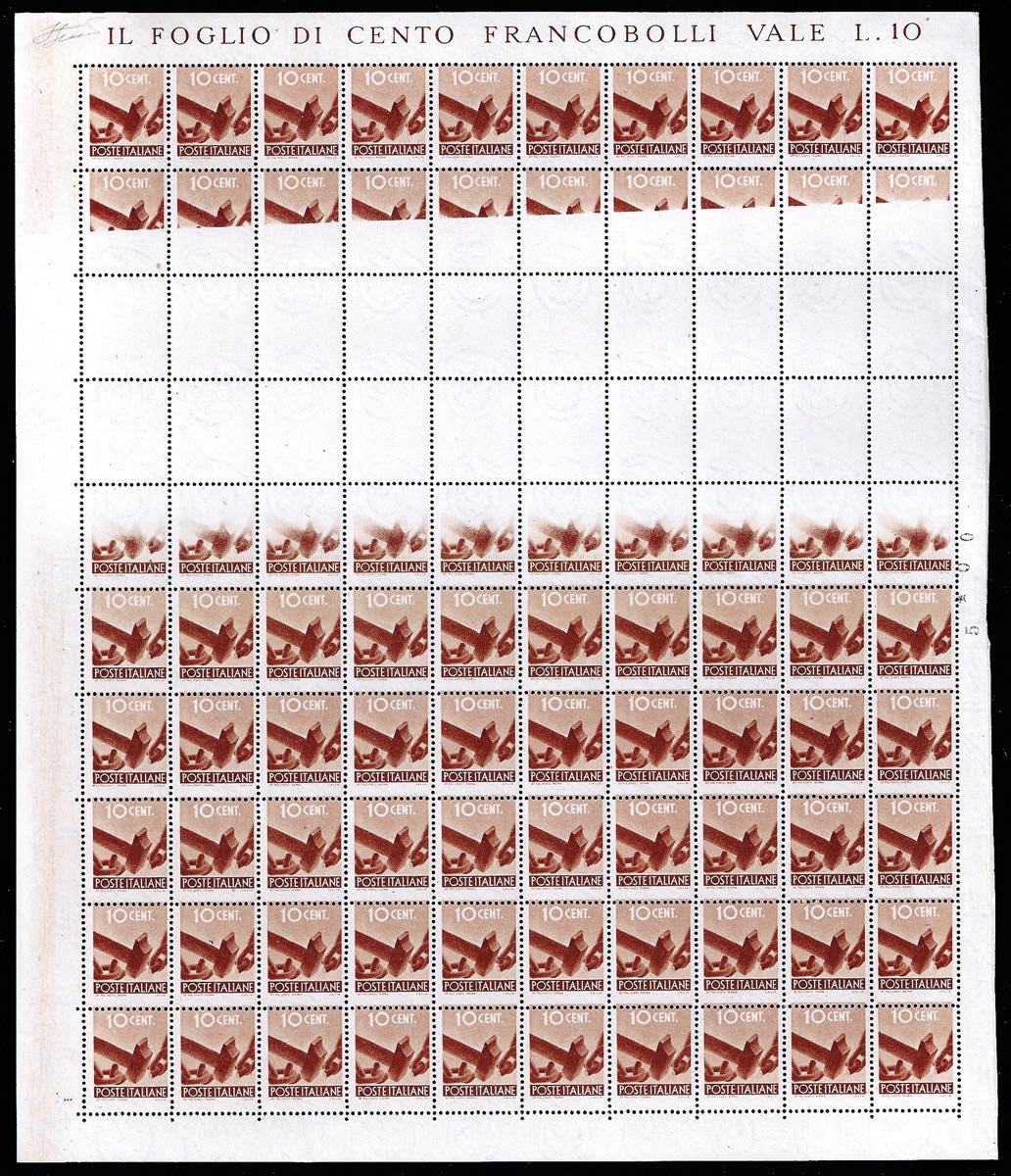 1945 - 10 cent. Democratica, foglio completo di 100 esemplari, composto da 10 strisce verticali ciascuna con un esemplare con stampa parziale, due con stampa totalmente mancante, uno con stampa evanescente (543gc), gomma originale integra, perfetto. Raro e spettacolare. Ferrario, cert. Raybaudi.