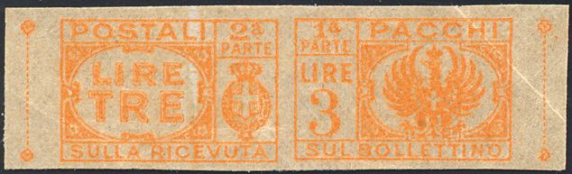 PACCHI POSTALI 1946 - 3 lire senza fasci al centro (62), stampato dal lato della gomma, non dentellato, perfetto. Non catalogato.