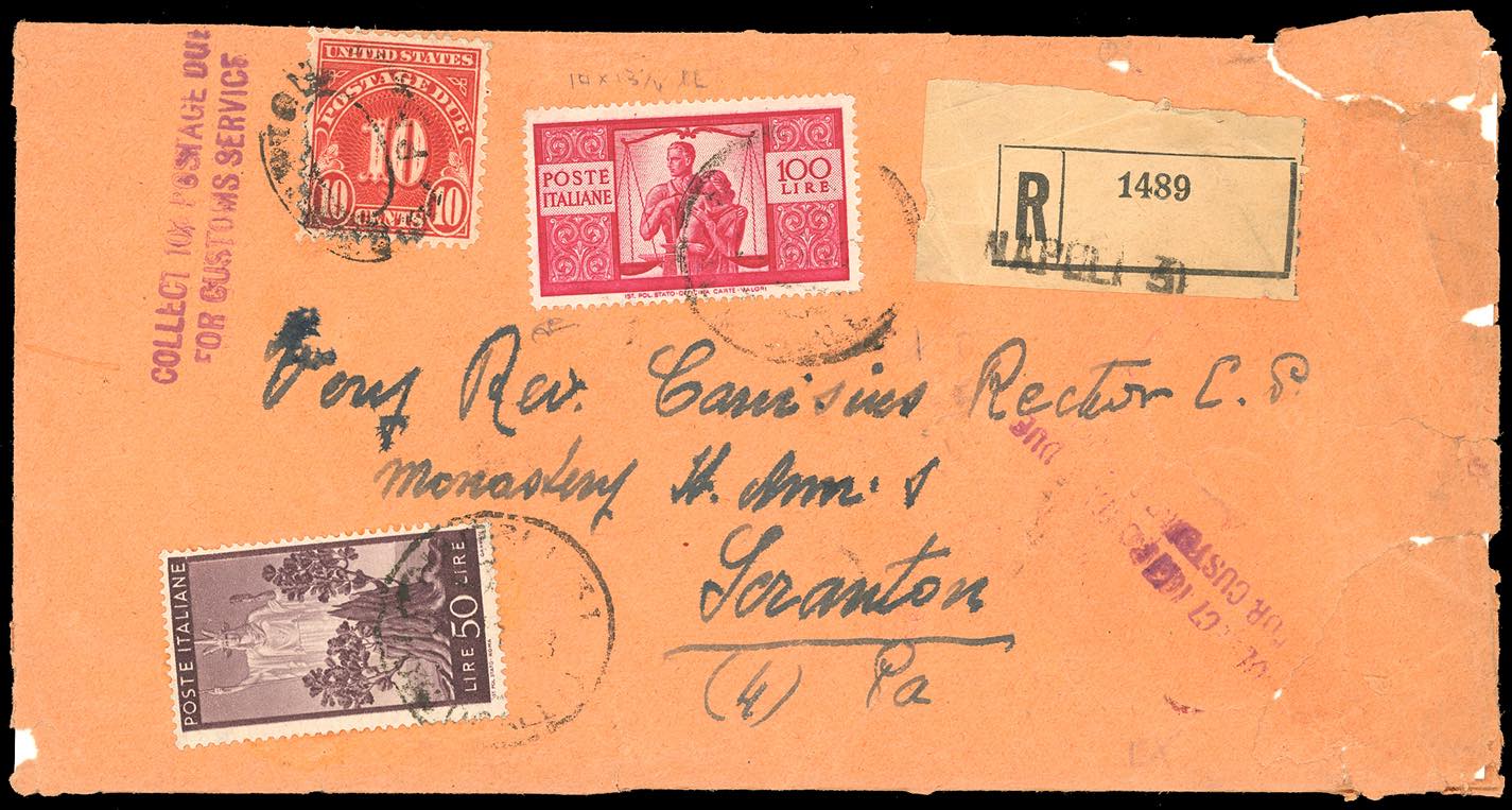 1948 - 100 lire Democratica, dent. 14 x 13 1/4 e 50 lire (565,564), su busta da Napoli 24/11/1948 a Scranton, Pennsylvania, negli Stati Uniti, tassata 10 cent. in arrivo per diritti doganali. Rara. G.Carraro.