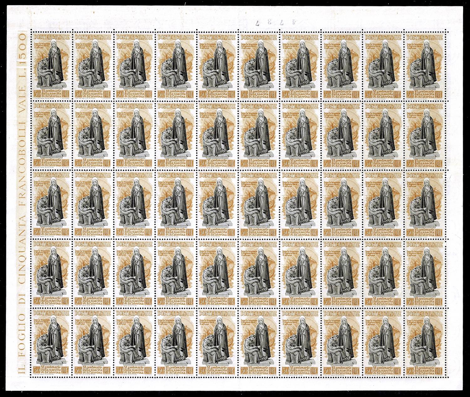 1948 - Santa Caterina, serie completa (574/577+A), fogli nuovi di 50 esemplari, gomma originale integra, perfetti e ben centrati. Il basso ... Leggi tutto