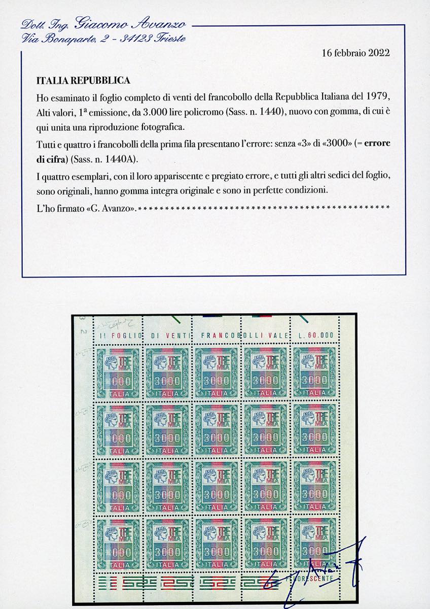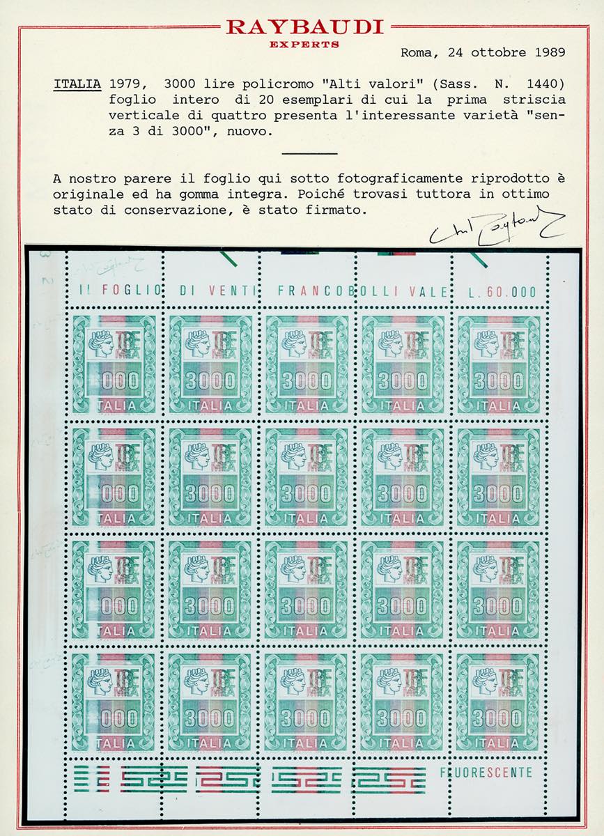 1979 - 3.000 lire Alti valori, minifoglio completo di 20 esemplari, i quattro francobolli della prima colonna con errore di valore "senza 3 di 3000" (1440A), nuovo, gomma originale integra, perfetto. Bella ed interessante varietà, molto rara in minifoglio completo. Cert. Avanzo e Raybaudi.