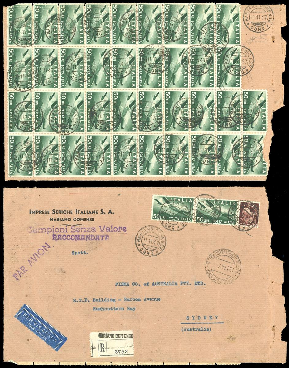 1947 - 50 lire Democratica, blocco di 38 esemplari al verso e sul fronte coppia, e 2 lire Democratica posta ordinaria (132,552), alcuni difetti, per complessive 2.002 lire, su plico raccomandato aereo per campioni senza valore di un porto ordinario e di 15 porti aerei da Mariano Comense 11/11/1947 a Sydney, in Australia. Massimo multiplo noto su questa lettera del 50 lire di posta aerea. Ferrario, cert. Sorani.
