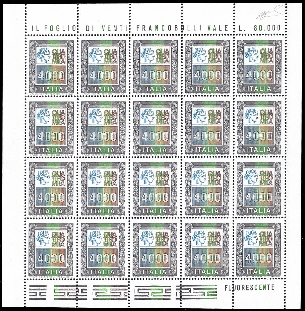 1978 - 4.000 lire Alti valori (1441), minifoglio di 20 esemplari, nuovo, gomma originale integra, perfetto. Ferrario.