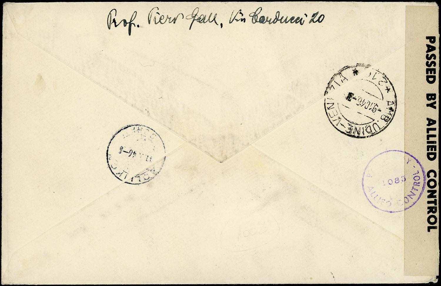 1946 - 5 lire Imperiale, soprastampa capovolta e fortemente spostata a destra (11dg), su busta raccomandata pluriaffrancata comprendente anche il 100 lire Democratica da Trieste 8/10/1946 a Zurigo, in Svizzera, verificata per censura. Si tratta probabilmente dell'unico esemplare noto su busta di questa rara varietà. Raybaudi, Ferrario.