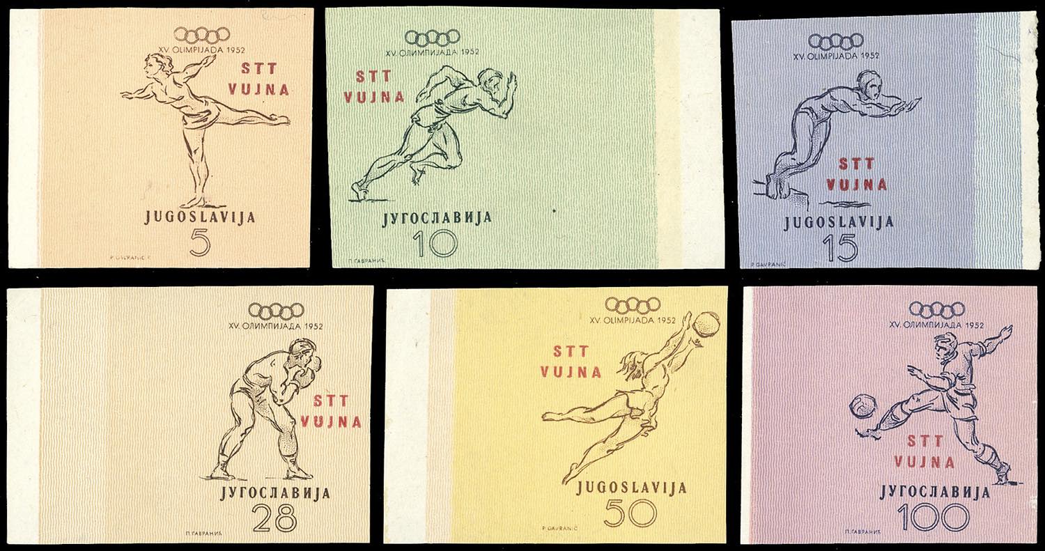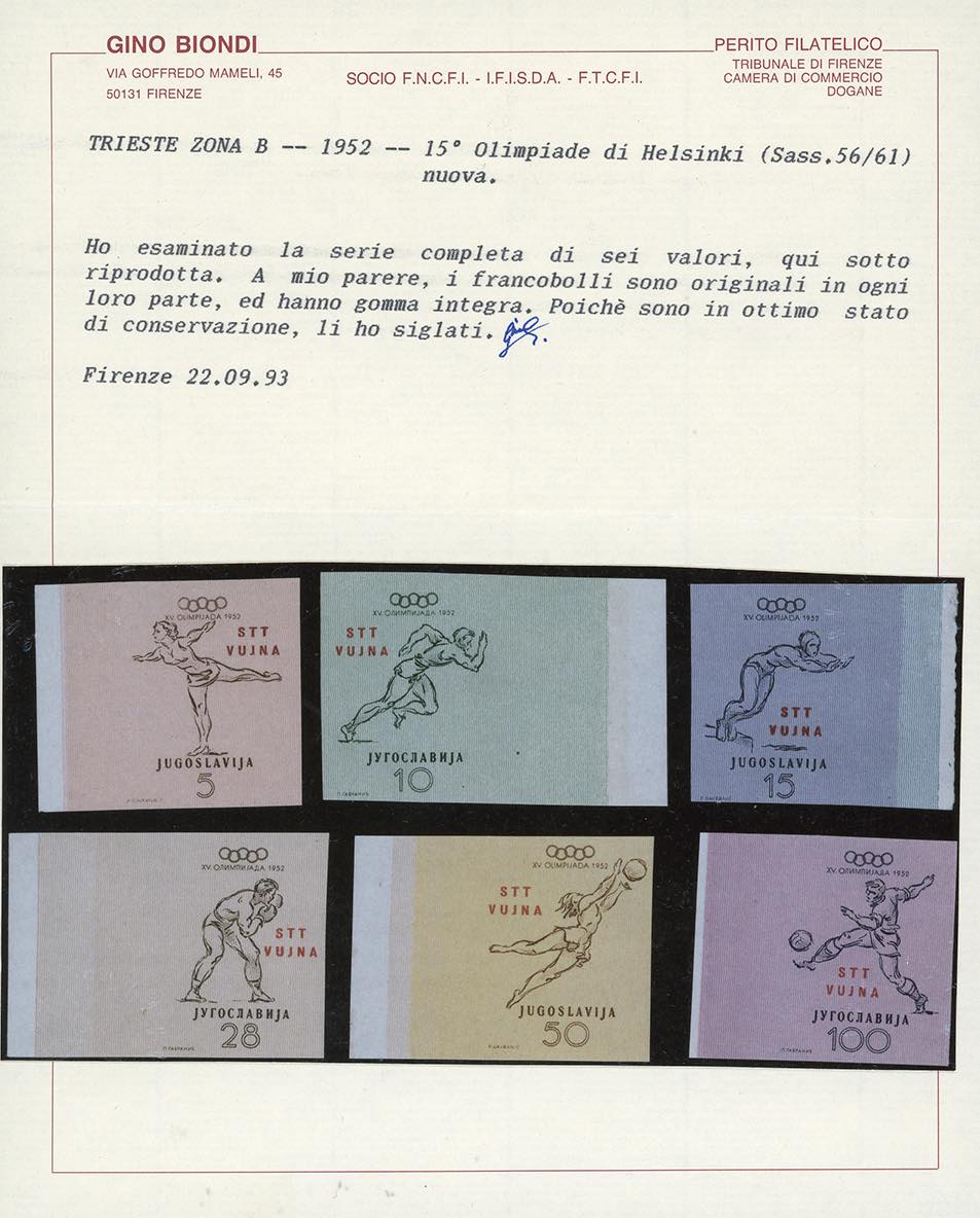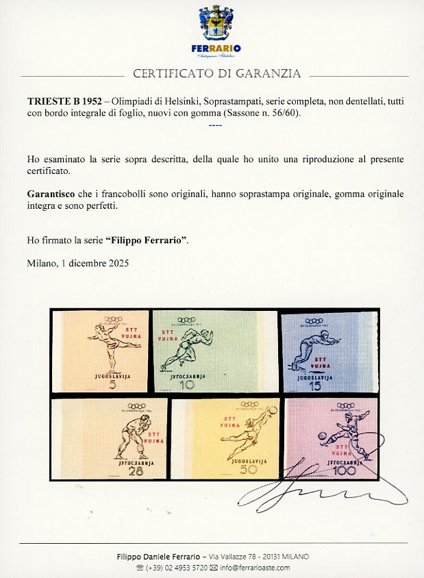 1952 - Olimpiadi di Helsinki, serie completa, non dentellati (56/60), tutti con bordo integrale di foglio, nuovi, gomma originale integra, perfetti. Bellissimi. Cert. Ferrario.