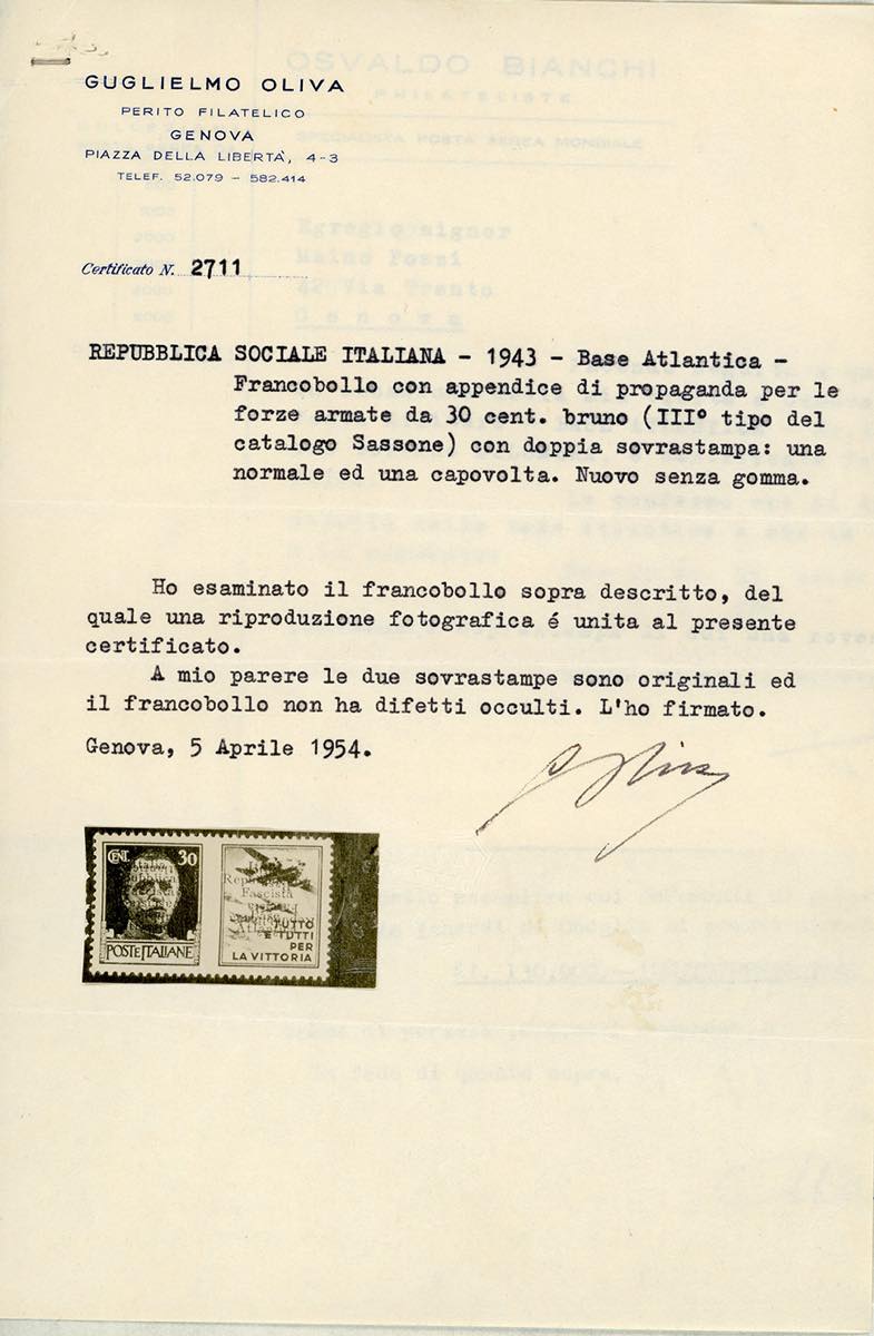 BASE ATLANTICA 1943 - 30 cent. Aeronautica, doppia soprastampa di cui una capovolta (18a), nuovo, senza gomma, perfetto. Molto raro. Cert. G.Oliva e Ferrario.