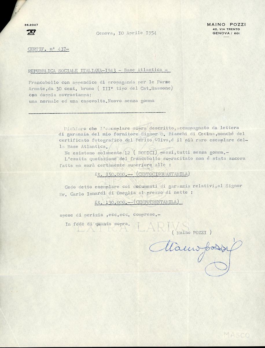 Lotto 1845 - BASE ATLANTICA 1943 - 30 cent. Aeronautica, doppia ...