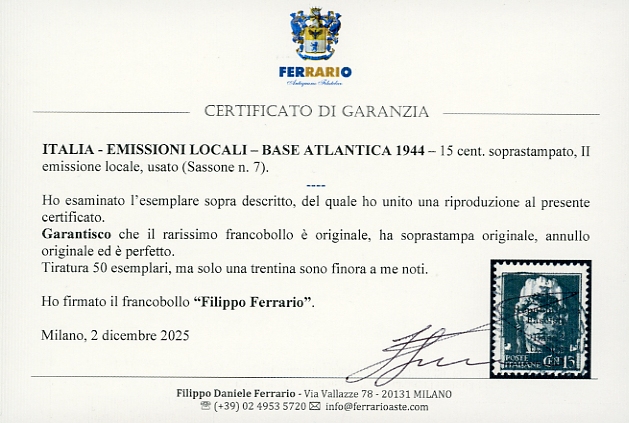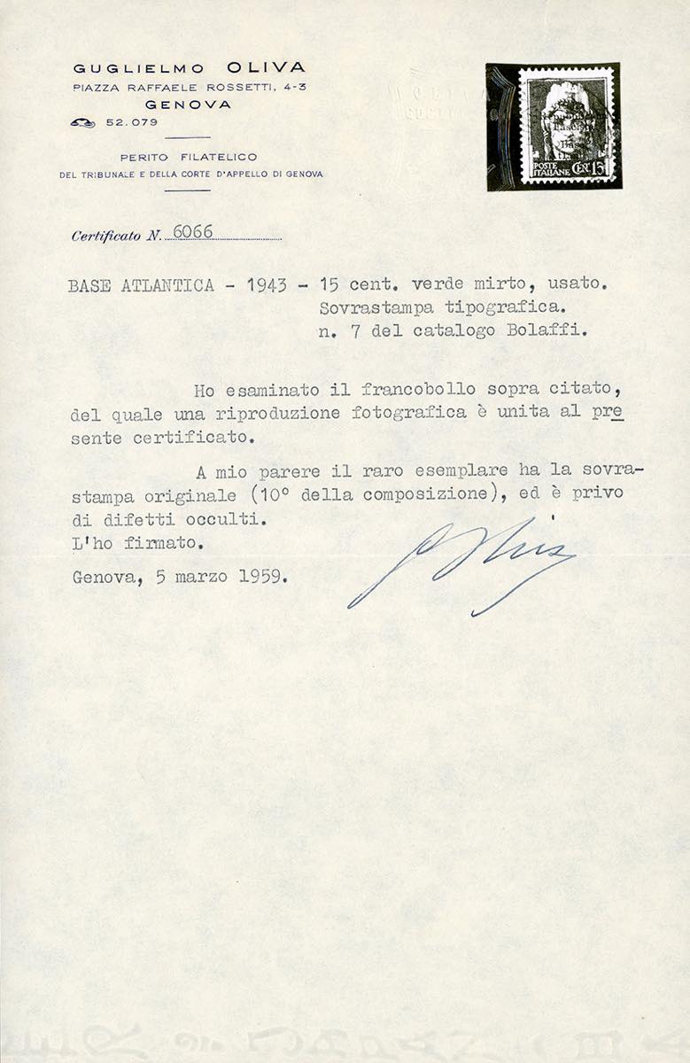 BASE ATLANTICA 1944 - 15 cent. soprastampato (7), posizione 10, usato, perfetto. Tiratura 50 esemplari, ma solo una trentina noti. Grande rarità del settore. Cert. G.Oliva e Ferrario.