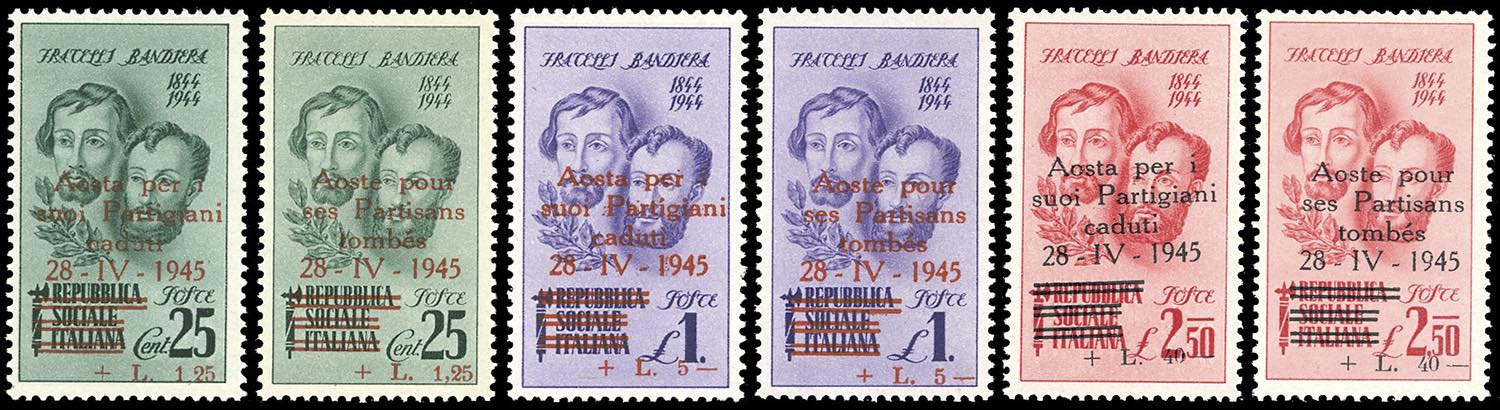 AOSTA EMISSIONE AUTONOMA DI PROPAGANDA 1945 - Fratelli Bandiera, una serie completa con soprastampa in italiano e una con soprastampa in ... Leggi tutto
