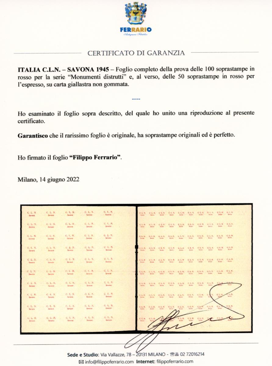 SAVONA 1945 - Foglio completo della prova delle cento soprastampe in rosso per la serie Monumenti distrutti e, al verso, delle cinquanta soprastampe in rosso per l'espresso, su carta giallastra non gommata. Insieme rarissimo . Cert. Ferrario.