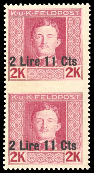 OCCUPAZIONE AUSTRIACA FRIULI-VENETO 1918 - 2,11 lire su 2 K., coppia verticale non dentellata al centro (17d), gomma originale integra, ... Leggi tutto